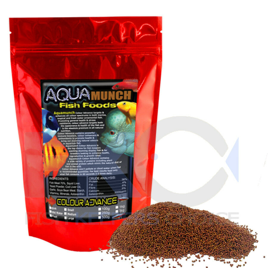 AQUAmunch Colour Advance Food sinking pellet suitable for most types of fish including Marine, Freshwater and Tropical’s. The food contains a balanced diet with added natural colour enhancers to bring out the best in aquarium fish appearance. Also containing probiotics to support health, digestion and disease resistance and does not contain protein from land animals, rather it has been made to replicate a more natural diet for most species of fish. This food is so good we use it ourselves and have found the fish to not only increase in health and colour but also an increase in reproductive. You only need to compare the ingredients with other brands of fish food to know this one is TOP OF ITS CLASS